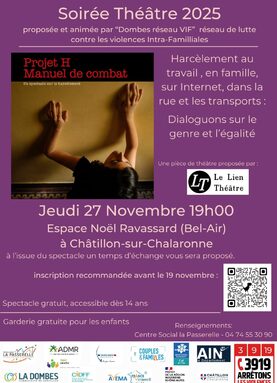 Par admin eugenedubois, publié le samedi 15 novembre 2025 16:42 - Mis à jour le samedi 15 novembre 2025 16:44Soirée proposée par "Dombes réseau VIF" sur le harcèlement au travail, en famille, sur internet... Une pièce de théâtre proposée par "Le Lien Théâtre" -